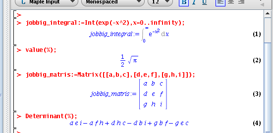 De röda raderna har jag alltså skrivit in, och de blå raderna har programmet svarat med. Du behöver aldrig utföra integraler eller manipulera matriser för hand igen! (Man hör ibland invändningen "Jo, om man blir strandsatt på en öde ö", men skulle man verkligen utföra integraler då?)